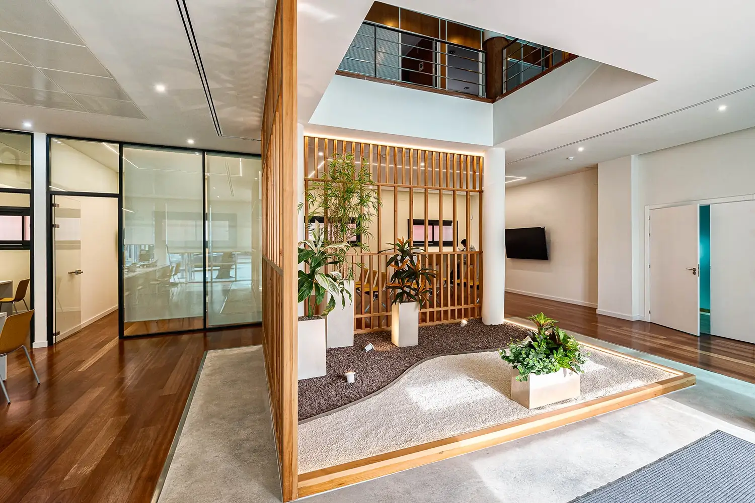 A central courtyard featuring greenery has been introduced as a unifying element within the space, while improvements in natural lighting and ventilation, alongside updated building facilities, contribute to a more contemporary and comfortable office setting.